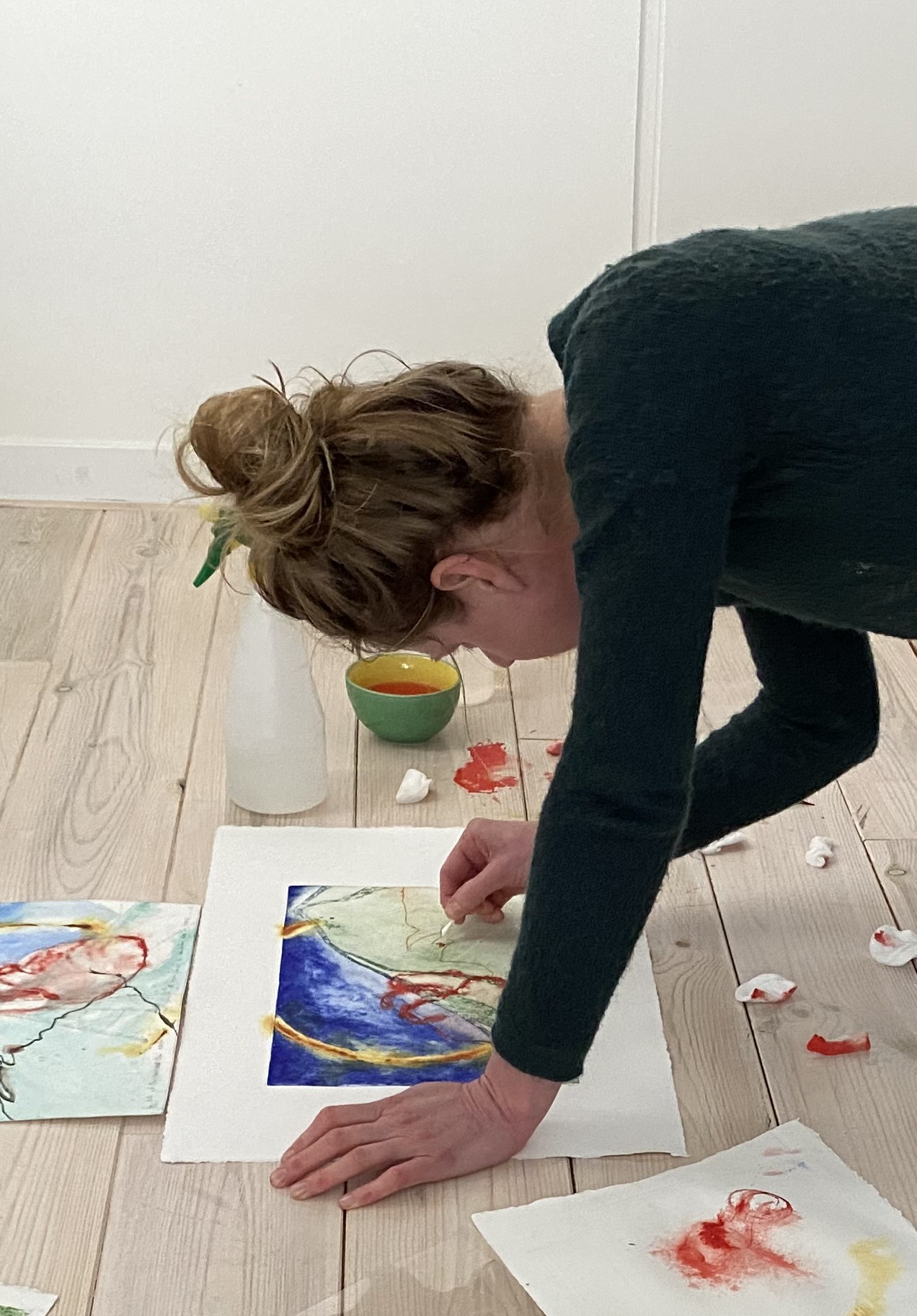 Ik gebruik vooral aquarel en grafische technieken als ets en monoprint. Beide technieken hebben een onvoorspelbare kant. Af en toe gaat er iets mis, en moet je daarmee verder werken. Dat geeft lucht.
